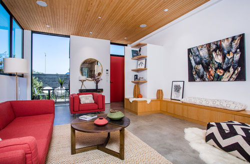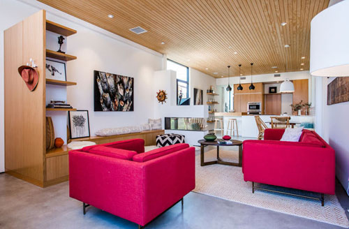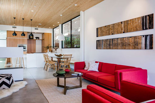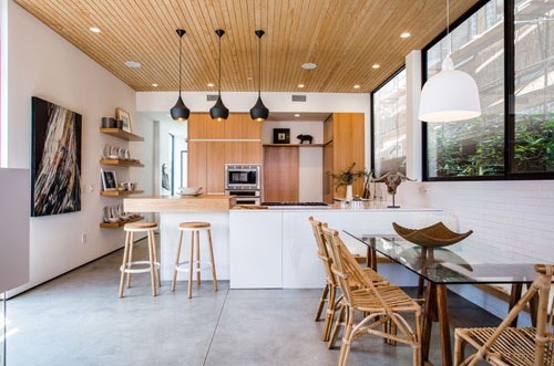 寬敞、通透的客廳里有定制的橡木櫥柜和長(zhǎng)凳,特別的定制效果既能用作儲(chǔ)物柜又能是座位。光滑的水泥地板下是輻射供熱系統(tǒng),條狀松木板天花延伸整個(gè)房間,因?yàn)樘舾叩脑?,住宅帶有閣樓的效果。