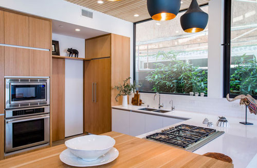 開(kāi)放式的廚房和餐廳使用了更多的木質(zhì)細(xì)節(jié),包括櫥柜、四個(gè)浮動(dòng)書(shū)架和兼具備餐區(qū)和早餐臺(tái)的實(shí)木吧臺(tái)。超大的窗戶、頂燈、白色墻面和白色工作臺(tái)面使廚房保持整潔、明亮和通透感。