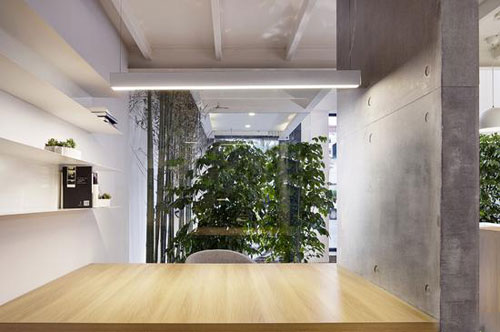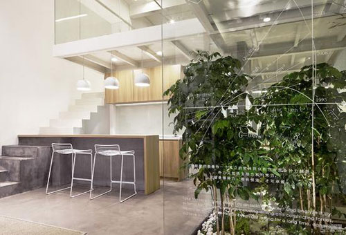 1層的獨立辦公區(qū)域被隱藏在植物后,辦公區(qū)視野盡端為精心營造的室內(nèi)景觀。