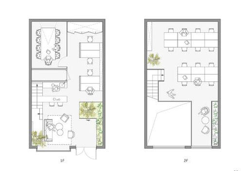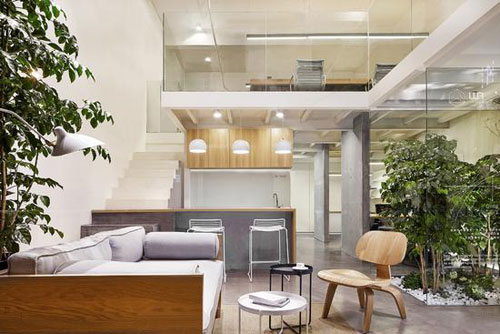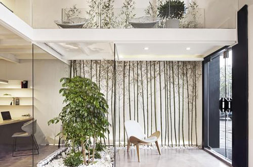 相對周圍的沿街商業(yè)辦公區(qū)域,這個郁郁蔥蔥的辦公室猶如沙漠里的一顆橡樹。穿過東南入口的一片室內(nèi)“竹林”,挑空的公共休閑區(qū)域,沙發(fā)(沙發(fā)裝修效果圖)、茶幾(茶幾裝修效果圖)、吧臺(吧臺裝修效果圖)、落地窗給人一種“賓至如歸”的感覺。另一方面,1層的獨立辦公區(qū)域被隱藏在植物后,辦公區(qū)視野盡端為精心營造的室內(nèi)景觀。會議室則被安置在最深處,整個空間強調(diào)了溫馨的生活理念,而弱化辦公空間的緊張性和冷漠性。