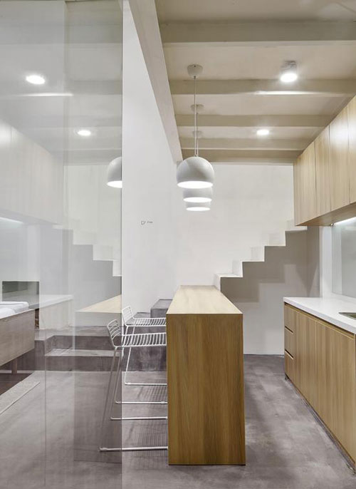 一、二樓的空間通過輕薄的樓梯 (樓梯 裝修效果圖)連接,水泥、木、金屬組成空間之間獨特的對話,吧臺與樓梯之間的結(jié)合也是“看似隨意”的精心設計。