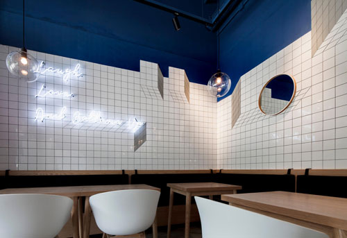 Swimming Pool Studio的設(shè)計(jì)團(tuán)隊(duì)為帕拉斯咖啡廳提供了一個(gè)極簡主義風(fēng)格的設(shè)計(jì),主要使用了干凈的線條和明亮的色彩。全高的窗戶沿著整個(gè)外墻的長度設(shè)置。這讓咖啡廳透明的入口上有了PARAS這幾個(gè)大膽的白色字母。雕刻般的梯形百合金被懸掛在了現(xiàn)代的咖啡吧臺(tái)上。這對地板和柜臺(tái)上的波狀幾何形狀來說是一種優(yōu)雅的補(bǔ)足物。這個(gè)圖案中的淺藍(lán)色也反射著咖啡廳寶藍(lán)色的屋頂。