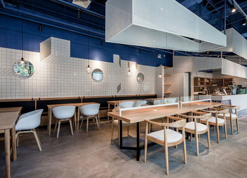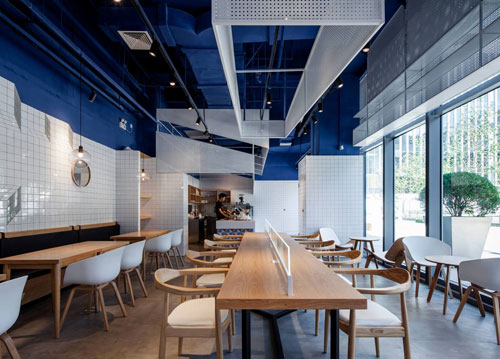 總而言之,這種對稱性為項(xiàng)目的設(shè)計(jì)帶來了一種無縫的質(zhì)量。左邊的餐廳區(qū)域?qū)ぷ骱蛯W(xué)習(xí)來說是一個(gè)完美的地方。你可以很容易的想象出拉出一個(gè)小的、戶外的桌子,并在上面放上一杯咖啡和一臺(tái)筆記本電腦的場景?;蛘吣阋部梢栽谥醒氲?、公共的桌子上和一個(gè)學(xué)習(xí)小組一起學(xué)習(xí)。白色的和藍(lán)色的墻壁提供了一個(gè)輕松的、簡單的背景,這不會(huì)對認(rèn)真學(xué)習(xí)的老顧客帶來任何影響。
