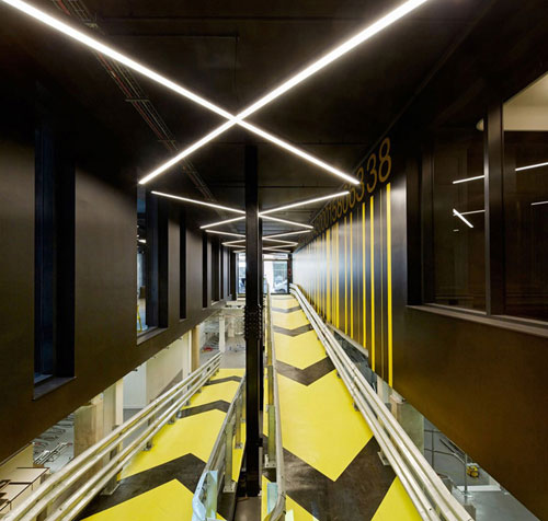 在倫敦芬斯伯里廣場經(jīng)??吹胶芏嗳蓑T著自行車進入到Alphabeta大樓,沿著一條醒目的黑黃相間的熒光坡道直接騎行至地下室。這里有超過兩百多輛的自行車停車位,還配有專門的更衣室和儲物柜、以及自行車維修空間。這里是倫敦首個可以騎行入內(nèi)的辦公大樓,也是本案與眾不同的一大亮點,鼓勵健康出行的生活模式。這幢大樓的每個空間都可以騎著自行車去欣賞、去體驗。