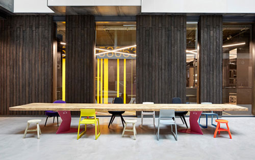 Alphabeta大樓共有九個樓層,擁有750 平米的超高中庭和共享的休閑設(shè)施以及屋頂露臺。改造后的中庭不再是財富和權(quán)力的象征,而是一個充滿時尚活力的公共休閑工作空間,一進入這里創(chuàng)新辦公文化氛圍撲面而來。一張長達五米的實木“餐桌”和各式好玩的座椅、漂亮的飾面板裝飾的閱覽區(qū)、新鮮烘焙的咖啡和蛋糕間、各式洽談桌和時尚摩登的沙發(fā)裝點了整個中庭,讓中庭不再只是空間的營造,更具有了實際功用和活力氛圍。建筑內(nèi)部采用通透的箱型懸挑結(jié)構(gòu)向中庭突出,長短大小尺度各異,形成豐富的空間層次感。新改造的Alphabeta大樓還增加了一個籃球場,豐富而多元的功能配置,讓時尚人士紛至沓來。