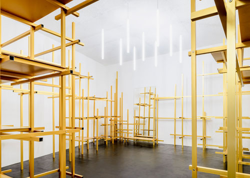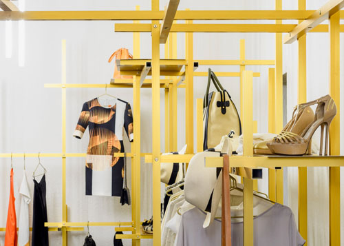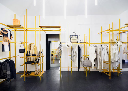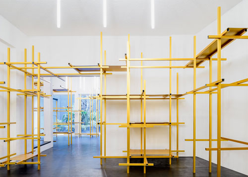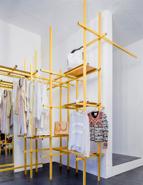 展廳的黃色金屬框架由垂直和水平的鋁桿組合而成,它們可以用作軌道,金屬板可以根據(jù)商品的不斷變換需要在獨立網(wǎng)格上移動。選擇鋁這種材料是因為它符合有限的預算并且安裝速度快。展廳地面鋪設黑色的橡膠地板,垂直的燈條分組點亮。