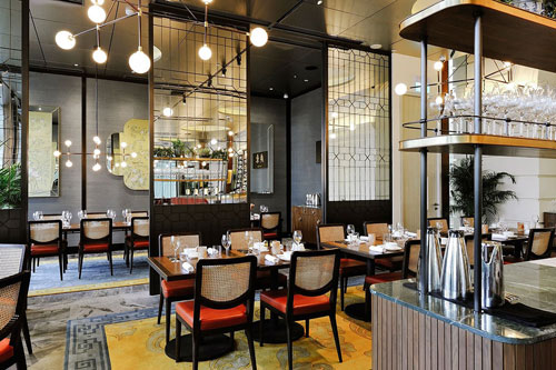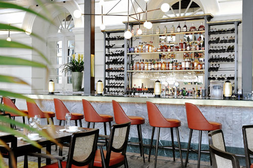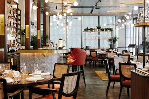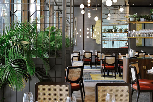 設計師考慮到餐廳特殊的地理位置:一側靠近新加坡河,一側靠近博物館,也因此設置了兩個入口。整個空間包括主用餐區(qū),以及一個由黃色屏風隔開的靈活的私人包廂。兩個大型獨立的服務站將餐廳分成兩個部分,包括那個令人印象深刻的六米長的大理石酒吧。三個開放式貨架由帶有銅質裝飾的實木板條制成,架身是垂直拼接的木條,桌面是一塊淺灰色大理石,整體呈現出一種高貴而內斂的氣質。再往上看,一組特別定制設計的吊燈安靜懸掛在天花板上,投放著溫和的光。它由青銅色的金屬、銅和玻璃球組合而成,三三兩兩的組合錯落有致,以呼應充滿歷史感的拱形墻飾,而酒吧大理石桌面上的燈籠狀燈具則更添一份浪漫。