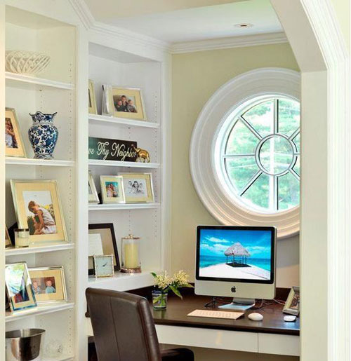 也是圓形窗戶(hù),寬厚的白色窗框搭配清透玻璃,視覺(jué)對(duì)比很別致。小空間的書(shū)房里,這樣一扇圓形窗戶(hù)就足夠了,恰到好處的光線(xiàn),恰到好處的墻面裝飾……一切都剛剛好。