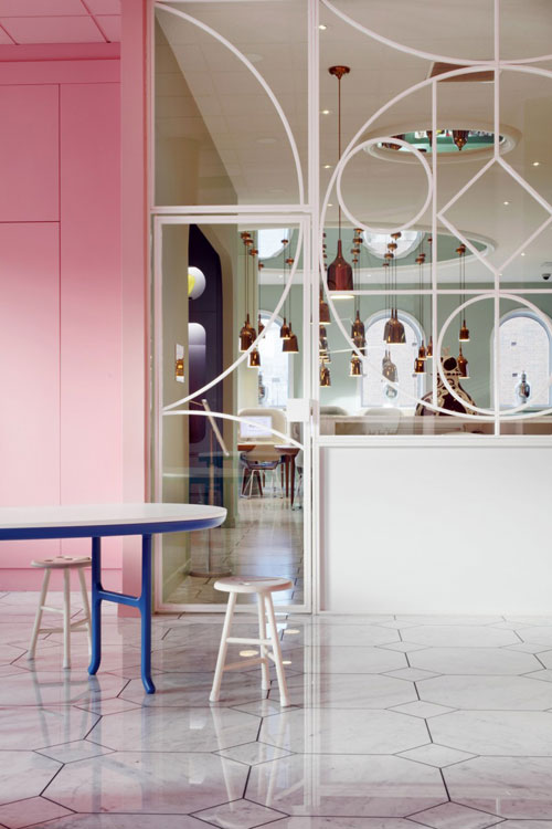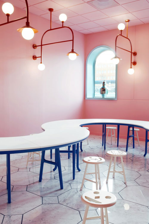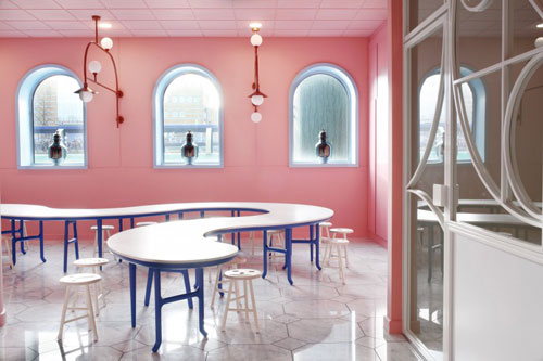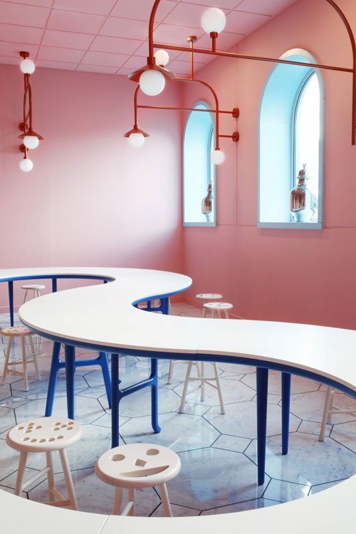 整個空間充斥著簡單又好看的細(xì)節(jié):空間里大膽的配色,造型獨(dú)特的家具,像是走進(jìn)了童話森林,任其天馬行空。粉色空間里的頭頂上有仿照樹枝的特制吊燈,而燈泡就像站在樹枝上的鳥,還有像小怪一樣面貌的凳子;一個看起來像蛇的大型工作臺占據(jù)了工作室的大半空間,鼓勵著訪客們相互交流。