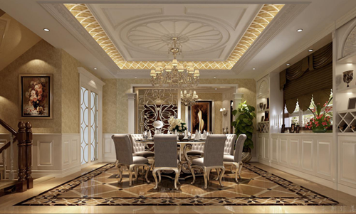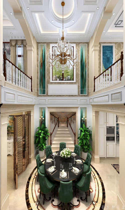 本案的設(shè)計(jì)風(fēng)格為奢華歐式風(fēng)格,餐廳典雅大氣,高貴華麗,具有濃厚的文化氣息。墨綠色的餐椅端莊又透著清新之風(fēng),這綠意又蔓延到桌上的插花、墻角的盆栽與墻上的掛畫(huà)上,設(shè)計(jì)師在細(xì)節(jié)上的用心可見(jiàn)一斑。吊燈造型古典別致,宛若一朵盛開(kāi)的白蓮花,二樓欄桿以黑白配色,簡(jiǎn)潔明了。整個(gè)空間呈軸對(duì)稱,讓視覺(jué)得到延展,舒適大方。