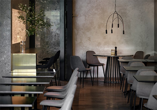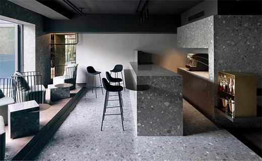 在這長(zhǎng)條形的空間里,南側(cè)從酒店大廳起至北側(cè)面向一條河流打開(kāi)。沿著長(zhǎng)條形空間,設(shè)計(jì)團(tuán)隊(duì)設(shè)計(jì)了一系列不同的微環(huán)境-從公共的到私密的,借用自然光線介入空間的不同的姿態(tài)為使用者創(chuàng)設(shè)不同的空間氛圍。一個(gè)可完全開(kāi)啟的大型折疊門(mén)意在吸引顧客走進(jìn)餐廳吧臺(tái)和餐區(qū)。特制的黃銅屏風(fēng)插在獨(dú)立的石頭吧臺(tái)上,成為空間中精致優(yōu)雅的視覺(jué)焦點(diǎn)。一些由黃銅制作的小元素節(jié)制地點(diǎn)綴在空間之中,豐富空間的同時(shí)并不打破原本優(yōu)雅的灰色調(diào)。吧臺(tái)區(qū)域?yàn)楦鞣N形式的社交活動(dòng)提供了足夠的可能性。