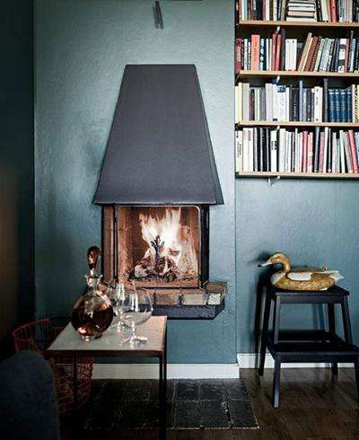 這是客廳的一個(gè)角落,暗藍(lán)色的墻面讓這個(gè)空間顯得很暗淡,但是壁爐和書(shū)柜的設(shè)計(jì)就讓這個(gè)小角落有了些許的文藝氣息,尤其是在冬天的午后,這個(gè)角落簡(jiǎn)直不要太舒適了,拿著一本書(shū)窩在壁爐前,溫暖又幸福。