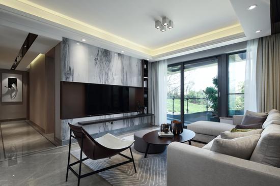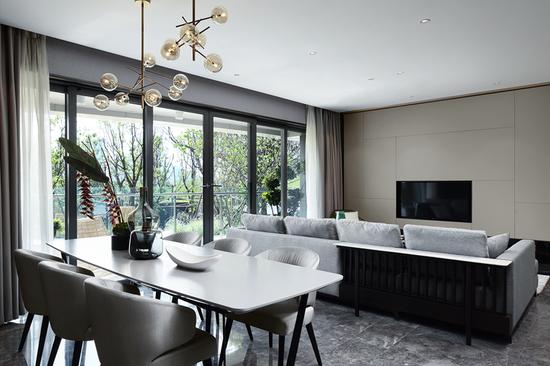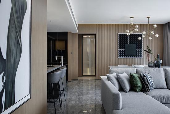 暗金色的旋律如一席暖流貫穿客廳餐廳,含蓄而有條理地梳理著棱角,也給灰色的布藝加入舒適的情緒。
