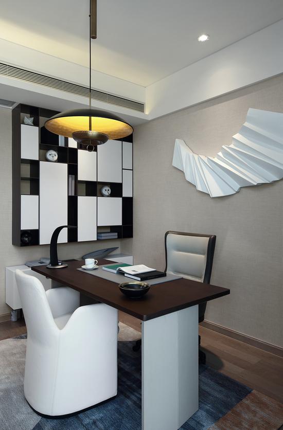 書房,簡潔的設(shè)計線條與偏冷的色調(diào)搭配以柔美的家具、還有幾何造型的擺設(shè),在冷靜與跳動間找到了讓人舒適輕松的氛圍。