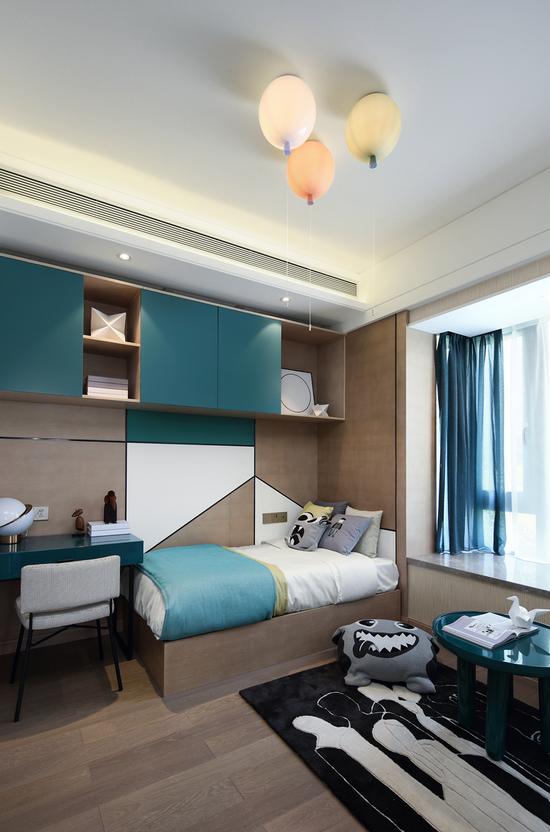 在兒童房中,設(shè)計師加入了經(jīng)典的寶石綠,規(guī)則有序的鋪開,緩緩的點燃童心,讓人感受到穩(wěn)穩(wěn)的喜悅和安全感 。