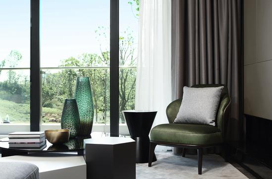 從客廳到餐廳,設(shè)計師用“灰”坐穩(wěn)中庸,再將其他色彩有度的展開,表現(xiàn)了張與弛的分寸感。茶幾上的一組玻璃器皿,通透、性感而活波,造型經(jīng)典,色彩含蓄又張揚,點綴其中有種心猿意馬,方落凡塵之感,讓人眼前一亮。呆在客廳角落的綠色單椅,與整個空間若隱若現(xiàn)的綠色塊相連貫,穩(wěn)持著那獨有的調(diào)性,點睛著客廳色彩的度。