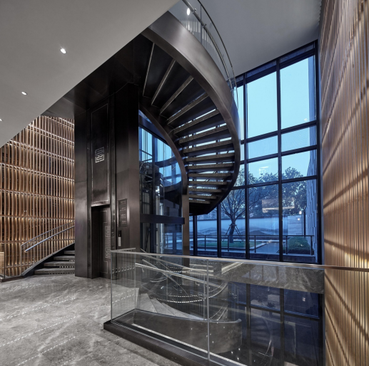 我們對這個(gè)建筑本身做了一些調(diào)整,玻璃的旋轉(zhuǎn)樓梯和戶外的光線,加上非常大的地面挑空讓采光井更寬大,讓地下室可以有更好的采光效果。地下室作為會所,這里面空間排布相對比較生硬,我們利用中間的圓廳將分開的部分做個(gè)結(jié)合。