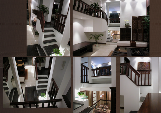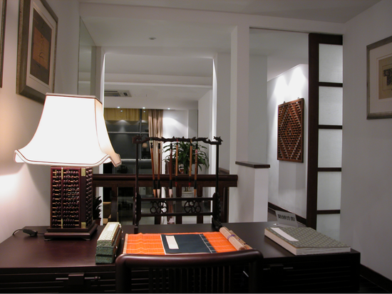 中式的空間描述,就像大家聽說過的“亭臺樓閣”。這是上海十幾年前做的一個(gè)案例,利用兩層的錯(cuò)層,客廳的部分是4.5米、4.5米往上疊。客廳旁邊作為附屬空間的部分,三米是正常的高度。錯(cuò)層和一般的高度變化時(shí),就有比較小的、一米多高度的錯(cuò)落,所以這種小的錯(cuò)落里面就完成了類似這樣的設(shè)計(jì)。這個(gè)案例有筆墨紙硯的元素,燈也是特別找來的。
