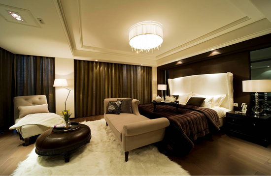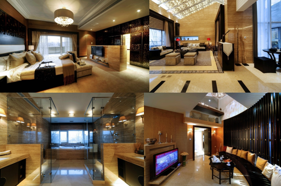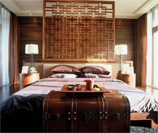 主臥房中間分了幾個(gè)層次,用了一些傳統(tǒng)中式圖騰的屏風(fēng),來界定幾個(gè)空間。走進(jìn)來第一個(gè)洗手臺,往下走是臥房,在往后面走是更衣室。這里沒有完全用中式家具,只要是質(zhì)感和我們的空間可以做成一個(gè)配合就可以的新式家具。