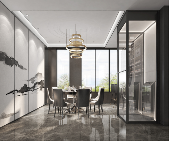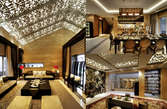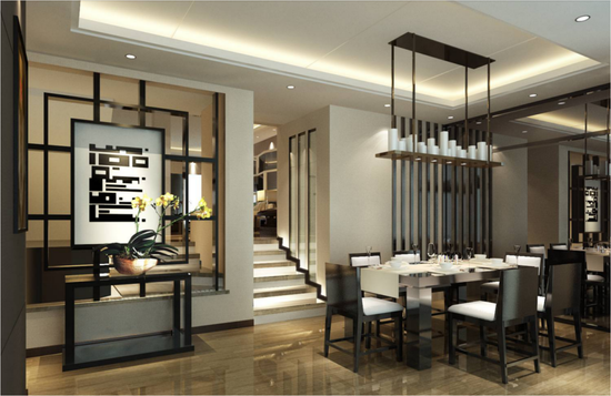 這是另外一套單獨(dú)的別墅,一方面是有了框景的手法,客廳和餐廳之間有個(gè)景的效果。用了一個(gè)類似植物來直接表達(dá)中式的感覺,內(nèi)部形成一種形態(tài),讓客廳和餐廳之間有進(jìn)一步的溝通。