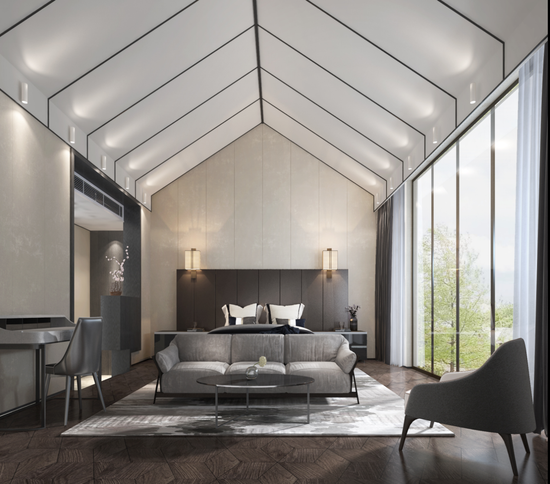 這套北京泰禾紅御別墅,這里最早是賣的二百多平單坡頂別墅,屋頂會顯得很小。設(shè)計(jì)的時(shí)候我們在窗簾上面做了個(gè)大鏡子,原來的在戶外看到的單坡頂在鏡子反射下來就變成是雙坡頂。所以來購房的人在外觀看這個(gè)是一個(gè)小別墅,但是進(jìn)來發(fā)現(xiàn)這個(gè)和他原來的衡量的內(nèi)部空間是有非常大的差異,給他相對震撼的效果,就對房型有特別的印象。