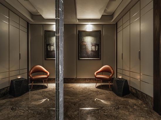 通道空間由于采光不足,利用淺色皮革材質(zhì),使其較為明亮。端點(diǎn)處的燈飾裝點(diǎn),再次為動(dòng)線起到導(dǎo)向作用,事無巨細(xì)地體現(xiàn)設(shè)計(jì)師的用心。