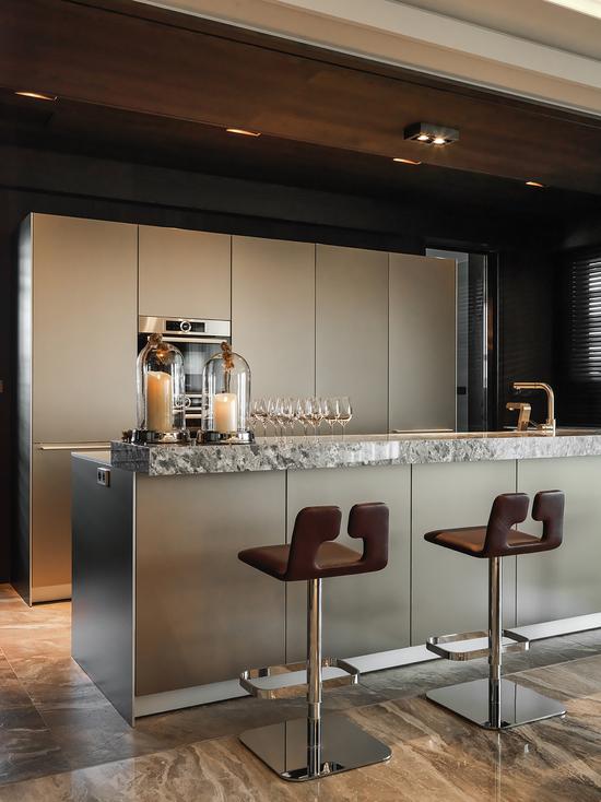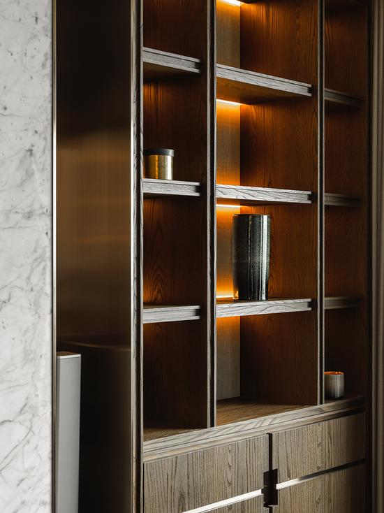 展示柜為空間中不可忽略的存在,業(yè)主的藏品之多使其呈現(xiàn)出藝?yán)鹊男Ч?。用精?zhǔn)的燈光使視覺聚焦。無論是小到門把手一樣的部件,還是低到視線最低點(diǎn)的踢腳線造型,整合了現(xiàn)代簡(jiǎn)約的設(shè)計(jì)手法,融合鍍鈦、金屬等流行元素,在不經(jīng)意間觸動(dòng)人心。