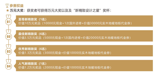 據(jù)悉,本次大賽最終的14位新精致設(shè)計(jì)之星將從中誕生。屆時(shí),獲獎(jiǎng)設(shè)計(jì)師將受邀參與大自然家居2019年1月9日年度設(shè)計(jì)盛典,并于現(xiàn)場(chǎng)接受頒獎(jiǎng)。