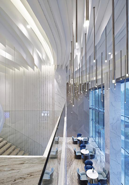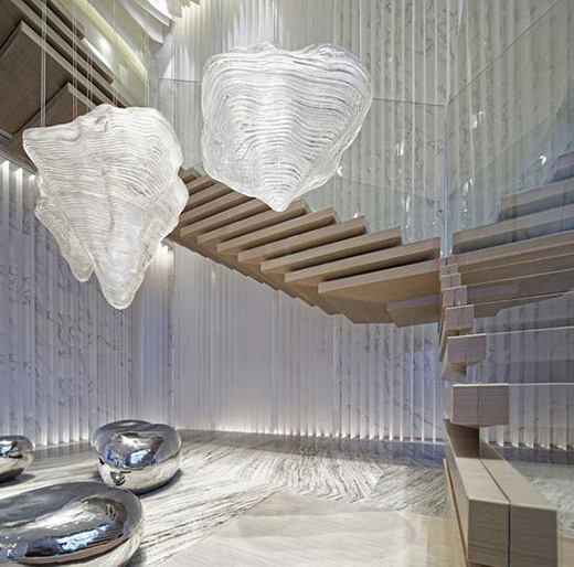 設(shè)計(jì)模糊了硬軟裝的界限,精神感知與物質(zhì)微妙互動(dòng),共同營建成一個(gè)抽象、輕盈又浪漫的詩意世界,伴著錢塘江的潮起潮落,人的心境在此,時(shí)而躍動(dòng),時(shí)而靜淌。