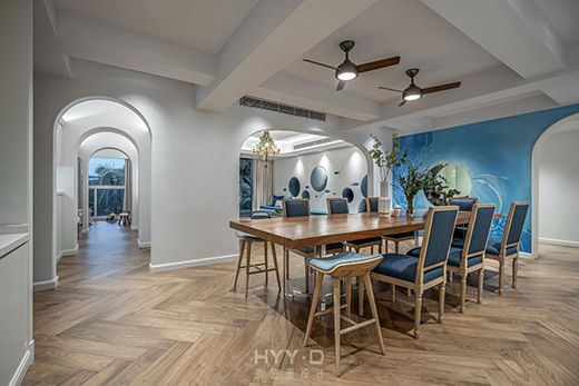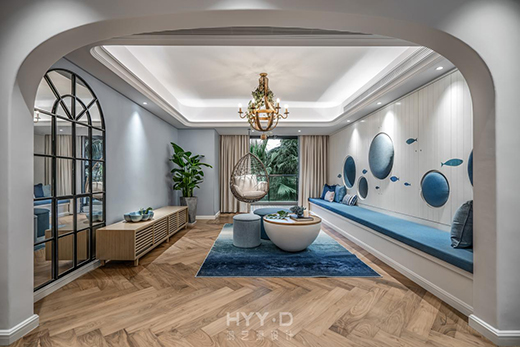 深圳卓越維港私宅設計剛好將鄭鴻這一理念完美演繹了出來。契合業(yè)主喜歡養(yǎng)魚的喜好,鴻藝源設計團隊在設計中,專門選取了海洋與魚的元素,以藍色作為點綴豐富空間層次。客廳墻上大小不一的圓孔設計,不僅能作為房屋的裝飾,還能作為收納圓墩的空間,加上時尚的竹制吊椅、多功能房的洞口設計等,極大地增加了房屋的互動性,生活其中,就仿佛置身于海底世界一樣,完全打破了以往家只是“住宅”這一單一的功能,增加了寓教于樂的生活趣味。