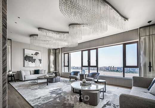 所以,在為高端用戶進行家裝設計時,鄭鴻與鴻藝源設計的設計師們通常會在其中融入能夠體現(xiàn)業(yè)主喜好、品味,甚至是文化背景的元素,打造獨有的個性化設計空間。這個個性化的設計通常會在細節(jié)中體現(xiàn)。如天地云庭私宅設計中的姓氏吊燈、客廳圓月型背景燈及走廊的文化墻等,便是潤物細無聲的在時尚簡約的家居空間中,注入了一份中式的文化氣韻。