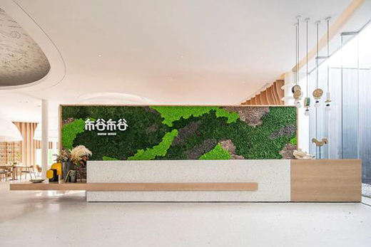 步入空間,入目是濃淡交織的綠植組合成的一面背景墻,層次豐富,搭配暖調(diào)木藝元素,予人清新澄澈的視覺美感。