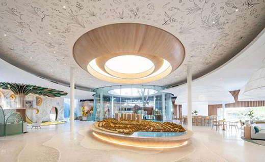 沙盤區(qū)的美感借由圓的層疊意象、形制、材質(zhì)展現(xiàn),形態(tài)各異的樹葉、蘭草、花瓣、布谷鳥、小木屋等物象融進(jìn)一幅畫,豐富了天花的線條美感,輔之以柔和的光源點綴,天花、沙盤模型、地面的圓形以立體視像上的映襯關(guān)系,塑造出空間獨特的質(zhì)感與別致的格調(diào)。