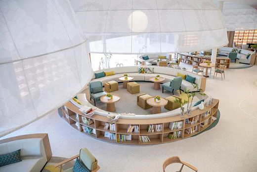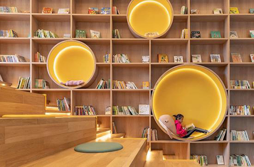 設(shè)計將自然的元素藝術(shù)化,空間的秩序在木藝的筆直線條中展露無遺,整齊有序的書架與天花弧度交接,連為一體,與層層遞增的階梯座椅對比強(qiáng)烈,以透明的圓形玻璃視角與布谷鳥窩主題兒童滑梯相映成趣。白云燈飾半懸于空,勾勒出燈帶富于變化的幾何美感,盎然成趣。