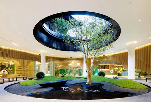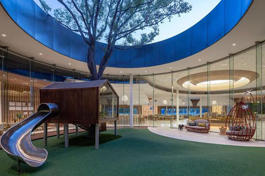 以透明玻璃作為區(qū)隔,構(gòu)建出一個大人與兒童無限向往的樹屋空間,粗壯蒼翠的大樹扎根于此,與鏤空圓形穹頂構(gòu)就天然的美學(xué)比例,枝葉無限延伸接近天空,室內(nèi)外的自然意趣一派和融。孩童們可穿過樹屋玩?;?,光影斑駁間,美好的童趣時光仿佛新生的枝芽,點染著空間的自然氣息,讓純摯快樂的氛圍不斷延續(xù)下去。