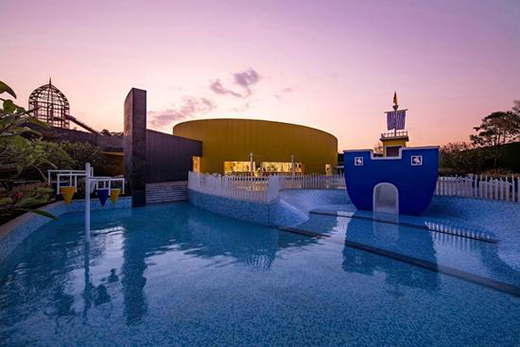 設(shè)計重點描摹家庭親子互動場域,以明朗活潑的色調(diào)敘事,延續(xù)著度假生活場景中愉悅舒心的畫面感。設(shè)計師以抽象的藝術(shù)手筆,打造了一個布谷鳥窩主題的兒童滑梯,搭配下沉泡泡池,黃、白調(diào)的糅合呈現(xiàn)出清新活力。在自然化與感官化的兒童視角下,墻畫上的蔥郁森林、趣味秋千、可愛鳥雀、多姿花草,盡顯純真與美好。