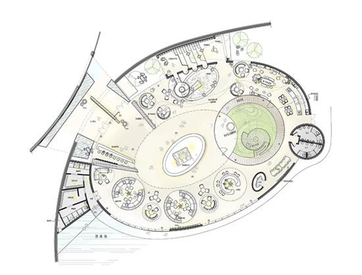 售樓處的建筑外觀,圓似一顆巨型的布谷鳥蛋,內(nèi)里蘊(yùn)含著沛然的生命與無限的生機(jī)。建筑內(nèi)部原層高為10米,顯得室內(nèi)空曠冷清,為了聚集人群,則靈藝術(shù)以內(nèi)建筑手法區(qū)隔具體的功能體塊,以透明蛋殼狀裝置籠罩在水吧、餐吧、書吧等功能區(qū)上方,創(chuàng)新性地將各功能區(qū)打造為一個個緊密的體驗場域,獨立而又相互呼應(yīng),極具藝術(shù)性地表達(dá)人與人之間恰到好處的距離尺度。