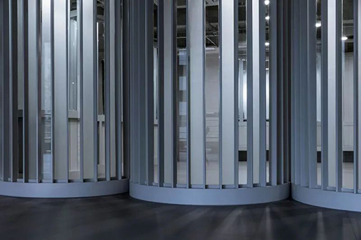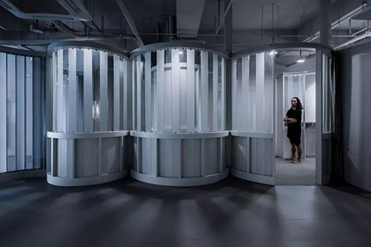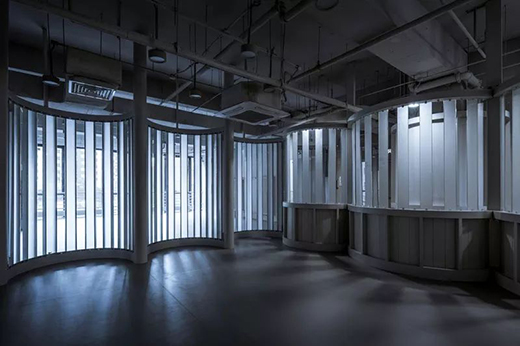 實(shí)際上,在舞蹈教學(xué)中,這種“觀賞”,自然地促進(jìn)了學(xué)員的學(xué)習(xí)動(dòng)力與表演熱情。成為優(yōu)秀的“展示者”,表達(dá)自己,用身體積極主動(dòng)地傳遞信息,這不正是舞蹈教學(xué)中非常重要的一部分么。身處“包間走廊”中的等待學(xué)習(xí)的學(xué)員,也在學(xué)習(xí)成為優(yōu)秀的“觀賞者”。正是這種表演與觀看的往來,促成了教學(xué)中生動(dòng)的模擬,讓這個(gè)過程變得生動(dòng)、有趣。由此,環(huán)境中的“形象符號(hào)”也變得更有提示性的作用:整個(gè)裝置立面中全部采用了豎向的線條,讓人聯(lián)想到古典劇院中褶皺的幕布。