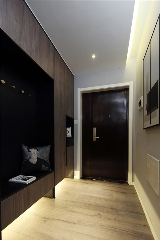 設計師希望業(yè)主從進門起就感受到空間的溫馨與安寧,洗去浮華,專注生活,仿佛進入與世隔絕的港灣。別致的玄關和墻上的裝飾畫共同演繹出戲劇十足的藝術空間,多功能儲物柜子既遮擋了墻體畸形部位,又滿足了業(yè)主進出家門的生活需要。