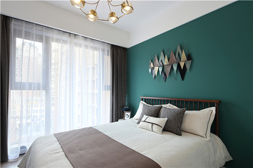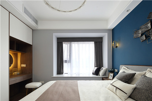 主臥以灰白搭配藍綠色系的主色調,灰色的內斂低調,白色的清新明快,墨綠色的沉穩(wěn)理性,融合出一種平衡的和諧之美。主臥四組燈光設計,滿足了業(yè)主看書時、梳妝時、更衣時、入睡時等不同時間對燈光的需求。
