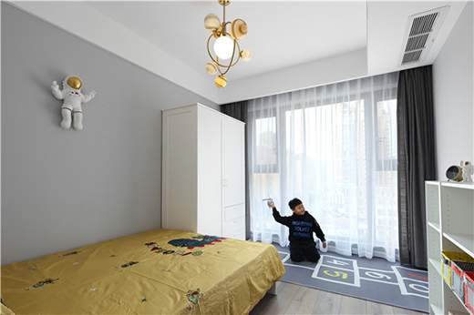 兼具衣帽間、儲物間、書房、臥室多功能空間,全屋嵌入式衣柜,有格調的飄窗,透著詩意,給業(yè)主一家人提供了一個機動靈活的私密空間和海量的儲物空間。
