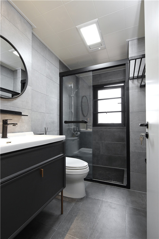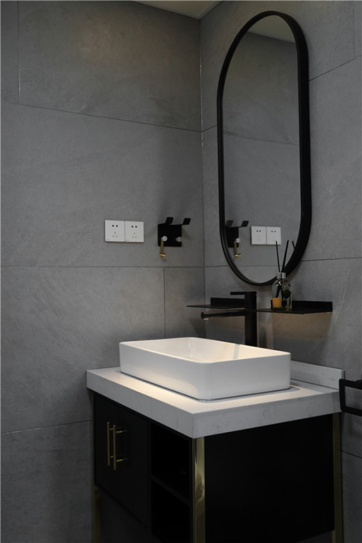 以灰色做為衛(wèi)生間的主色調,不但顯得清爽,也有一種舒適的優(yōu)雅品味。衛(wèi)生間的設計細節(jié)到位,吊頂完美掩飾了建筑結構的缺陷;次衛(wèi)空間規(guī)劃彌補了原本的畸形結構,與此同時設計師巧妙的利用畸形部位做了壁龕置物。