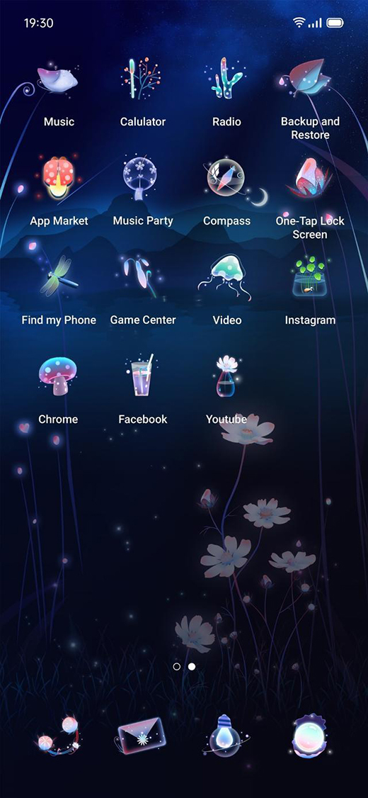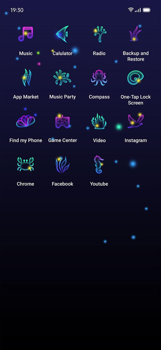 好奇貓Curious Cat發(fā)現(xiàn)OPPO用戶對(duì)于可愛(ài)風(fēng)格的主題接受度很高的特點(diǎn),結(jié)合東南亞人比較喜好熒光效果,創(chuàng)作的《sea world》用深色為底,配以發(fā)光的植物和動(dòng)物,同時(shí)加入小氣泡和熒光粒子來(lái)營(yíng)造海洋的感覺(jué),讓人感受的寧?kù)o的同時(shí),又不會(huì)過(guò)于死板。