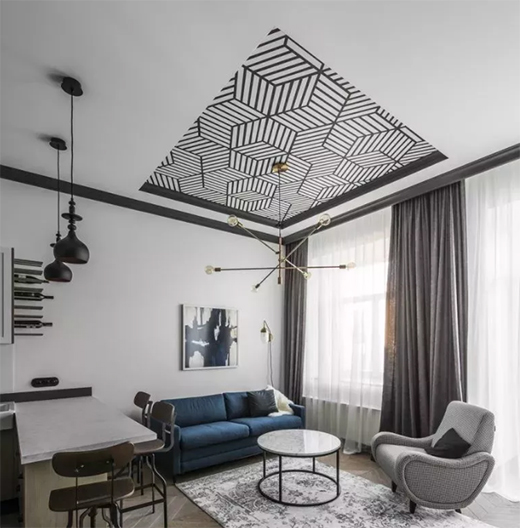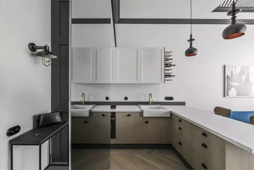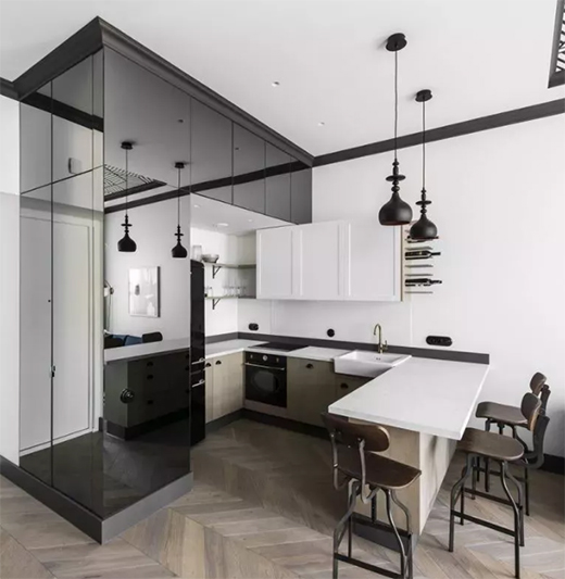 這是一個小戶型,開放式的廚房和客廳,設計師將一面墻壁處理成深灰色,因為對面和房頂有更大面積大白色與之配合,最后人們得到的是比中間調子更明亮的視覺感受。