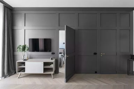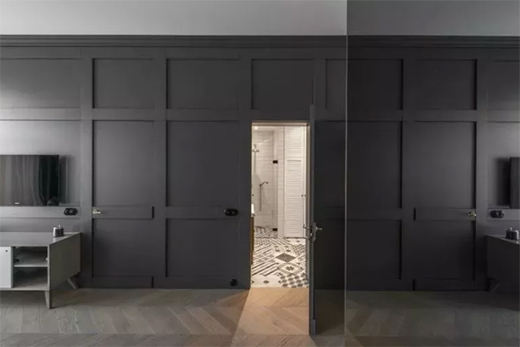 電視墻是一個有意思的創(chuàng)意,因為那里暗藏著通往臥室的門,這很酷,看完節(jié)目可以關掉電視同時打開臥室的門。