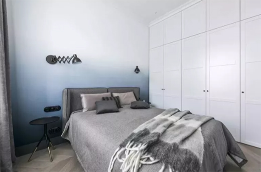臥室設計非常簡單,左邊是窗簾,右邊是衣柜,床頭背景墻使用了從灰藍到白色的漸變色,營造了一種縹緲的感覺,實際上這是一個折中的方案,為了讓床頭和白墻的對比不那么生硬,從小編角度看,對一個臥室來說,還可以亮一點,睡眠和保持個人精神氣質的關系不如放松更直接。