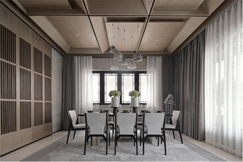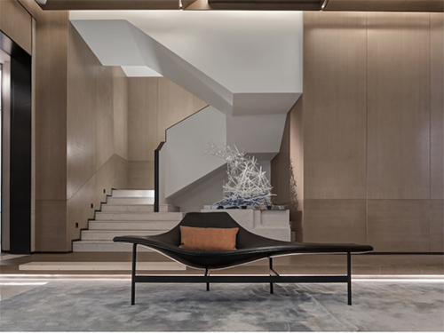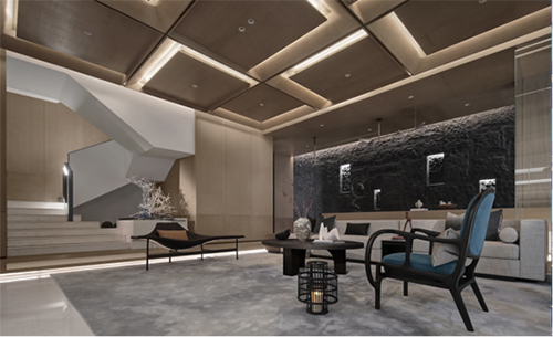 室內(nèi)公區(qū)天花吊頂造型簡潔且呈立體陣列感,無中式符號,卻顯出東方的莊重大氣,天花與墻面在色調(diào)上的呼應(yīng)統(tǒng)一,強化了空間在視覺上的延伸感。家具呈現(xiàn)結(jié)構(gòu)線條感,皮革材質(zhì)予人舒適與質(zhì)感;地毯選用加絲面料,更注重親膚觸感。