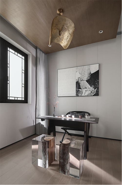 飲茶在嶺南文化中占有重要的一席之地,茶室意境與書房不同,更具傳統(tǒng)意韻。黃銅鑄造的吊燈如荷葉自然寫意,主人椅點亮主旨,客凳則由鉑晶樹脂與原木融合,東西交融意味十足。
