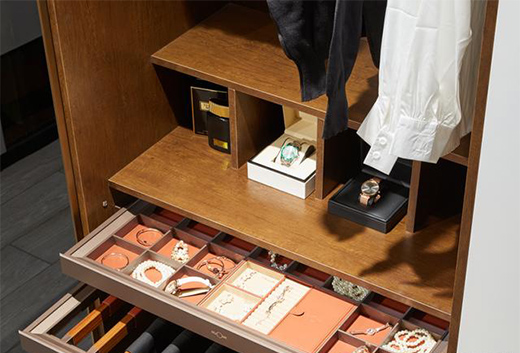 △分格抽屜是首飾的最佳擺放區(qū),開放架下層也做分隔設計,將手表等大件首飾擺在小格子中,滿足愛美的心。上方大平臺可以放置包包,用多姿多彩的包包們撫慰疲憊的心。