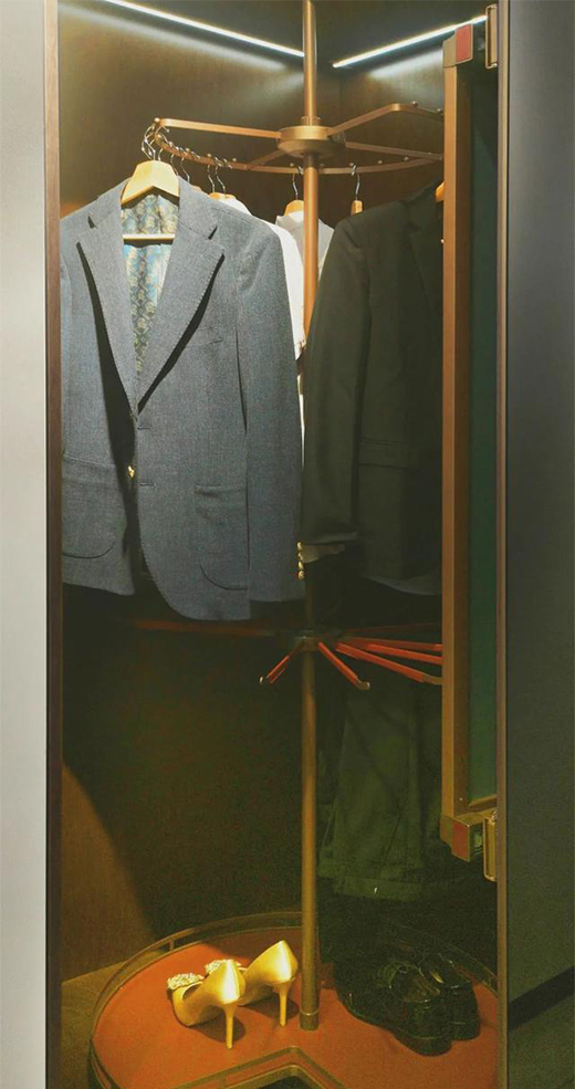 △轉(zhuǎn)角處設計為開放式掛衣區(qū),分為上中下三層,上層環(huán)形旋轉(zhuǎn)掛衣架,中層扇形旋轉(zhuǎn)褲架,底部設計為托盤樣式的旋轉(zhuǎn)式鞋架,將常用衣物鞋履收納于此處,日常出行輕松愜意,節(jié)省時間,對上班族非常友好。